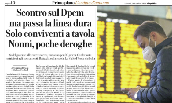 L'edizione odierna de "La Repubblica" si sofferma sulle misure anti-Covid 19 in vista del periodo natalizio. E' passata la linea...