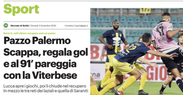 Gds: “Pazzo Palermo. Scappa, regala gol e al 91’ pareggia con la Viterbese”