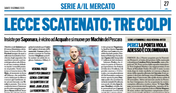 L'edizione odierna di "Tuttosport" riporta le trattative del giorno in Serie A: "Obiettivo reale Quintero per il Genoa, il fantasista...