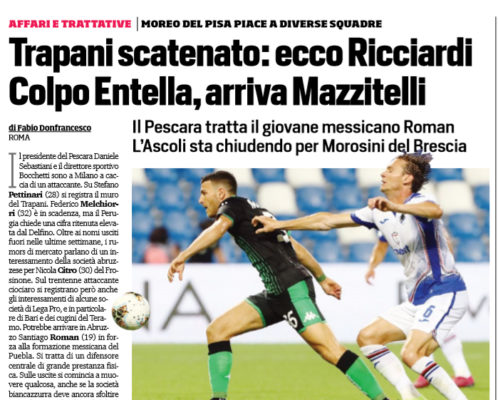 L'edizione odierna del "Corriere dello Sport" si è soffermata sulle trattative di mercato del campionato di Serie B. Il Pescara...