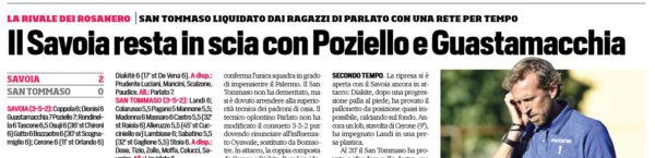 L'edizione odierna del "Corriere dello Sport" si sofferma sulla vittoria del Savoia contro il San Tommaso. Con un gol per tempo...