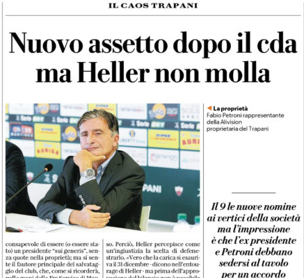 L'edizione odierna de "La Repubblica" si sofferma sul caos in casa Trapani. Non sono ancora finiti i dissidi tra Heller...