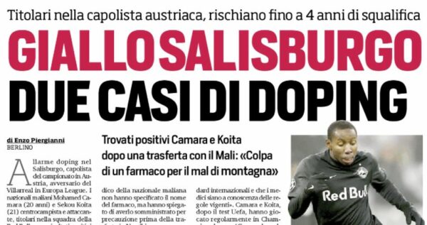 L'edizione odierna del "Corriere dello Sport" si sofferma sul Salisburgo. E' allarme doping nel club austriaco. I nazionali maliani Camara...