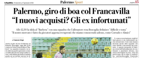 L'edizione odierna de "La Repubblica" si sofferma sulla sfida fra Palermo e Virtus Francavilla, riportando le dichiarazioni del tecnico rosanero...