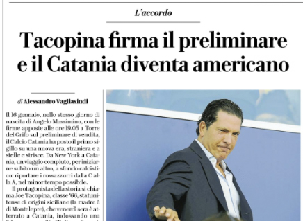 L'edizione odierna de "La Repubblica" si sofferma sull'approdo di Joe Tacopina al Catania. Il 16 gennaio alle 19.05 ha firmato...