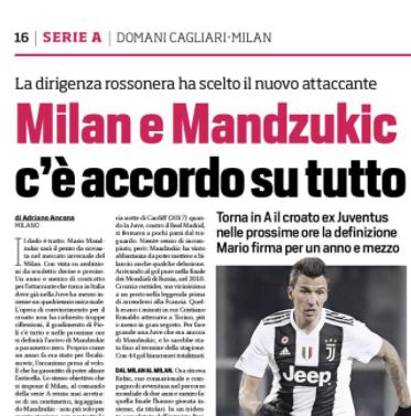 L'edizione odierna del "Corriere dello Sport" si sofferma sul calciomercato in Serie A. Mario Mandzukic è promesso sposo del Milan....