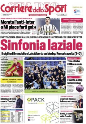 L'edizione odierna del "Corriere dello Sport" dedica la sua prima pagina al derby fra Lazio e Roma. I biancocelesti schiantano...