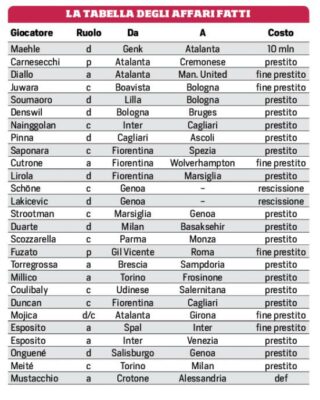 L'edizione odierna del "Corriere dello Sport" riporta la tabella degli affari di calciomercato già conclusi. In basso l'elenco completo: