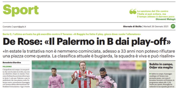 L'edizione odierna del "Giornale di Sicilia" riporta le dichiarazioni di Francesco De Rose, nuovo centrocampista del Palermo. «Qui c’è tutto...