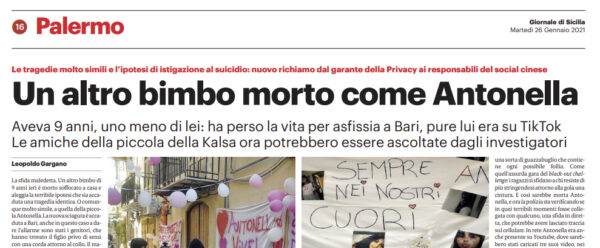 L'edizione odierna del "Giornale di Sicilia" si sofferma sulla morte per asfissia di un bimbo di 9 anni a Bari....