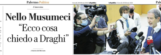 L'edizione odierna de "La Repubblica" riporta le dichiarazioni di Nello Musumeci, governatore della Sicilia: «Governo Draghi? È l’unico rimedio possibile,...