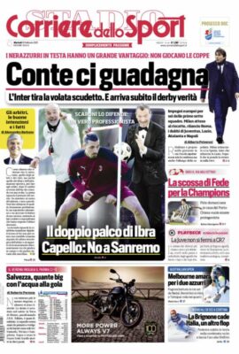 La prima pagina dell'edizione odierna del "Corriere dello Sport" si sofferma sulla volata scudetto. Arriva il derby verità. Conte ci...