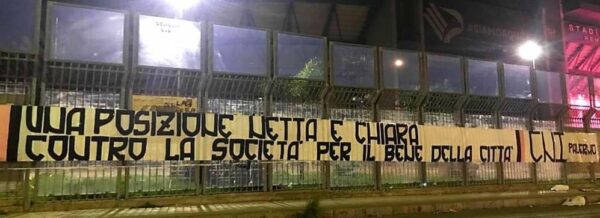 "Posizione netta e chiara. Contro la società per il bene della città". Recita così lo striscione esposto all'esterno del "Barbera"...