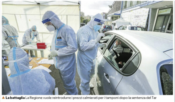 L'edizione odierna di "Repubblica" parla della questione tamponi. Il Tar di Palermo cancella il tetto di 15 euro a tampone...