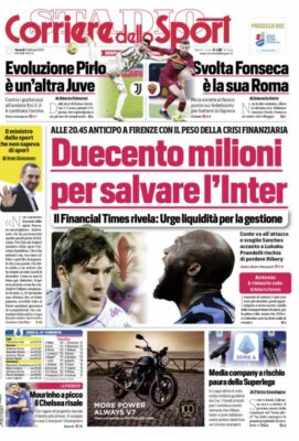 La prima pagina dell'edizione odierna del "Corriere dello Sport" si sofferma sulle difficoltà dell'Inter. Il Financial Times rivela: urge liquidità...