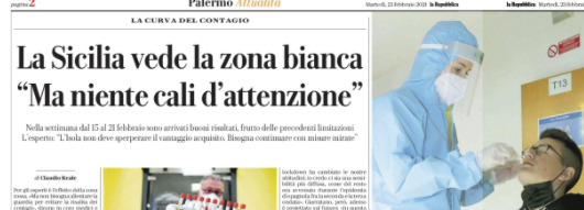 L'edizione odierna de "La Repubblica" si sofferma sulla possibile zona bianca in Sicilia. «Ma non bisogna allentare la guardia per...