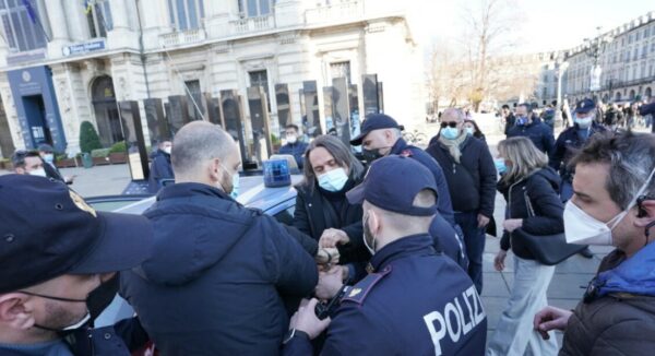No Mask e No Vax in piazza a Torino: “I contagi e le terapie intensive sotto pressione? Invenzioni mediatiche. Diteci cosa mettete nel vaccino”