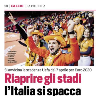 L'edizione odierna del "Corriere dello Sport" si sofferma sulla possibile riapertura degli stadi in Italia" «Applicando le restrizioni da far...