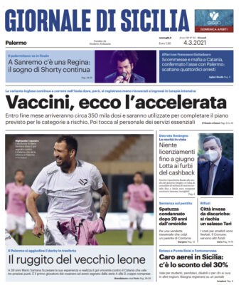 Prima pagina Giornale di Sicilia: “Il Palermo si aggiudica il derby in trasferta. Il ruggito del vecchio leone. Vaccini, ecco l’accelerata”