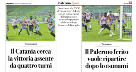 L'edizione odierna di "Repubblica" parla del grande derby di Sicilia che si giocherà stasera. A Torre del Grifo nessuno si...