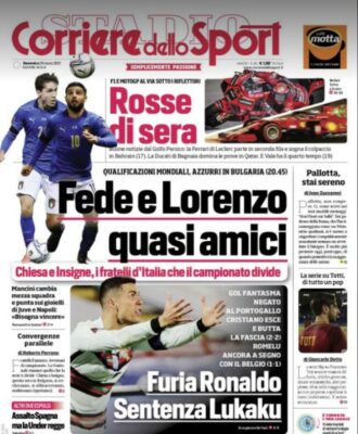La prima pagina dell'edizione odierna del Corriere dello Sport si concentra sulla sfida di questa sera dell'Italia contro la BUlgaria,...