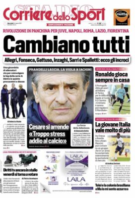 La prima pagina del "Corriere dello Sport" si sofferma sulla rivoluzione nelle panchine di Serie A. Cambiano tutti: da Fonseca...