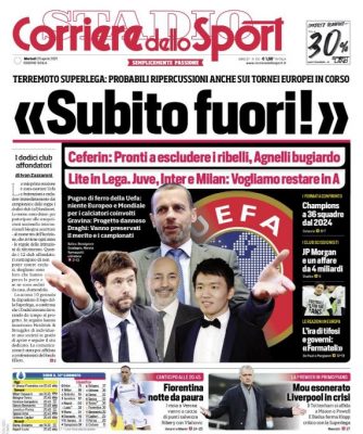 La prima pagina del "Corriere dello Sport" dedica ampio spazio al progetto Superlega «Subito fuori!» è il grido dei contrari....