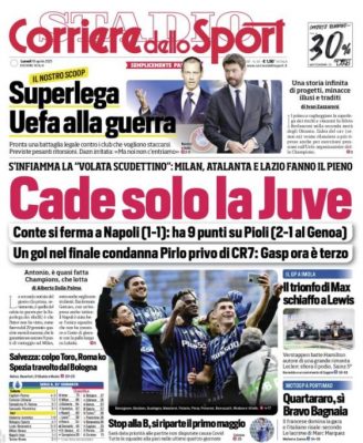 La prima pagina del "Corriere dello Sport" si sofferma sulle polemiche relative alla nascita della Superlega. Uefa pronta all'attacco. Serie...