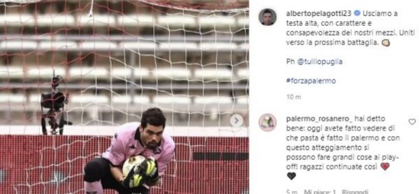Il portiere del Palermo Alberto Pelagotti commenta così su Instagram il pareggio per 2-2 contro il Bari: "Usciamo a testa...
