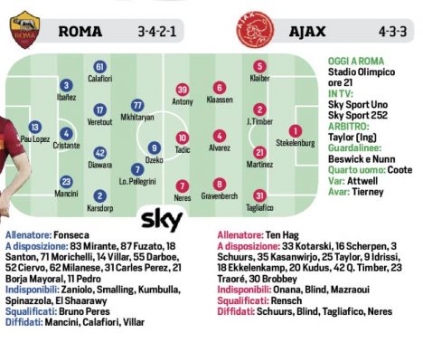 Corriere dello Sport: “Europa League. Stasera Roma-Ajax, le probabili formazioni”