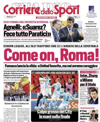 La prima pagina del "Corriere dello Sport" esalta la Roma, alle prese con la semifinale di andata di Europa League...