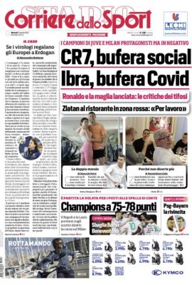 La prima pagina del "Corriere dello Sport" si sofferma sulle critiche piovute addosso a Cristiano Ronaldo e Ibrahimovic. Il fuoriclasse...