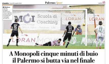 L'edizione odierna de "La Repubblica" si sofferma sulla sconfitta del Palermo contro il Monopoli. I rosa, dopo essere passati in...