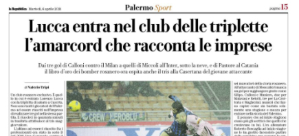 L'edizione odierna de "La Repubblica" si sofferma sull'ingresso di Lorenzo Lucca nel club delle triplette rosanero. L'ultimo ad esserci riuscito...