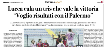 Repubblica: “Lucca cala un tris che vale la vittoria «Voglio risultati con il Palermo»”