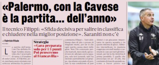 L'edizione odierna della "Gazzetta dello Sport" riporta le dichiarazioni di Giacomo Filippi, allenatore del Palermo, in vista della sfida contro...
