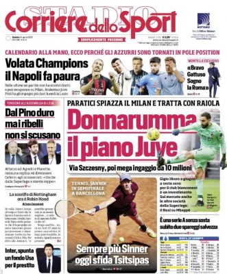 La prima pagina dell'edizione odierna del "Corriere dello Sport" si sofferma sul piano della Juve per Donnarumma. Paratici tratta con...