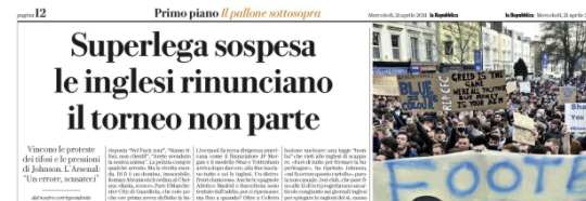 L'edizione odierna de "La Repubblica" si sofferma sul dietrofront della Superlega. Manchester City e Chelsea rinunciano. A tarda sera lo...