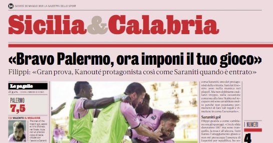 L'edizione odierna della "Gazzetta dello Sport" riporta le dichiarazioni di Giacomo Filippi, allenatore del Palermo: «I ragazzi sono stati bravissimi...