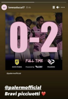 L'attaccante rosanero, Lorenzo Lucca, esulta sul proprio profilo instagram per la vittoria dei suoi compagni nel secondo turno dei playoff...