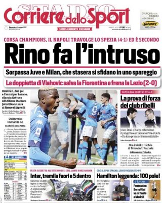 La prima pagina del "Corriere dello Sport" si sofferma sul successo del Napoli contro lo Spezia. Rino fa l'intruso e...