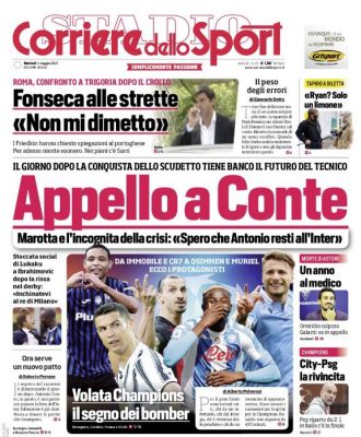 La prima pagina del "Corriere dello Sport" si sofferma sull'appello di Beppe Marotta ad Antonio Conte. L'incognita crisi incombe: «Spero...