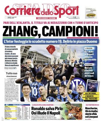 La prima pagina dell'edizione odierna del "Corriere dello Sport" è interamente dedicata alla conquista dello Scudetto da parte dell'Inter. L'Atalanta...