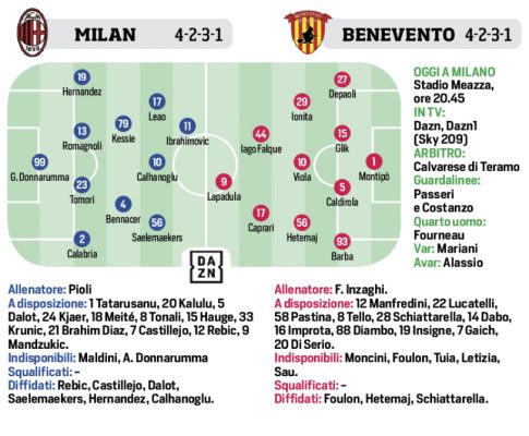 Corriere dello Sport: “Serie A. Stasera c’è Milan-Benevento. Le probabili formazioni”