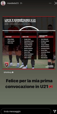 Prima chiamata dall'Under21 albanese per il giovane rosanero Massimiliano Doda. Questa la stories condivisa su Instagram: