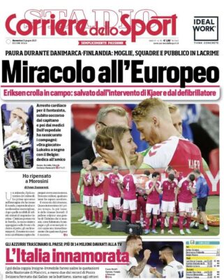 Prima pagina Corriere dello Sport: “Miracolo all’Europeo. Eriksen salvo grazie a Kjaer e il defibrillatore”