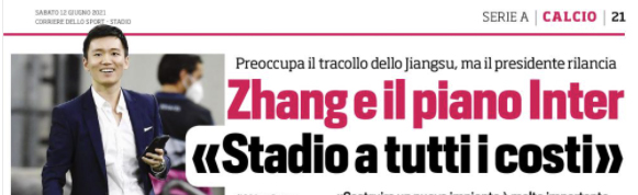 Corriere dello Sport: “Serie A. Preoccupa il tracollo dello Jiangsu. Zhang e il piano Inter «Stadio a tutti i costi»”