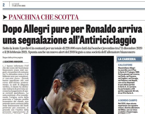 Anche per Cristiano Ronaldo arriva una segnalazione dell’Antiriciclaggio. Nel mirino, prelievi in contanti per 220mila euro fatti dal giocatore della...