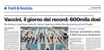 L'edizione odierna del "Giornale di Sicilia" si sofferma sulla campagna vaccinale e sulle riaperture. Il record di oltre 600 mila...