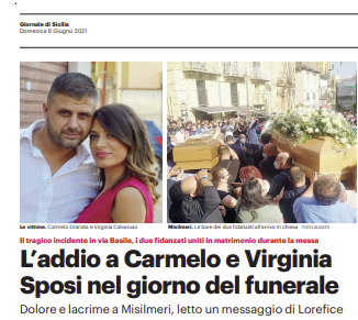 L'edizione odierna del "Giornale di Sicilia" si sofferma sulla tragica scomparsa di Carmelo Granata e Virginia Calvaruso. Sposi per sempre...